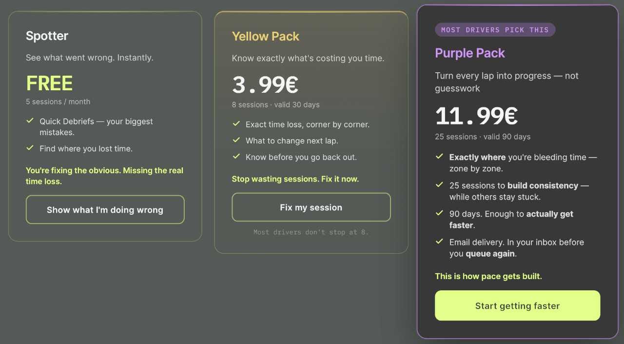Tier 3 costs 11.99€ a month but includes 25 sessions' worth of data across 90 days. Analysis is more granular and is what PitDelta.co recommends.
