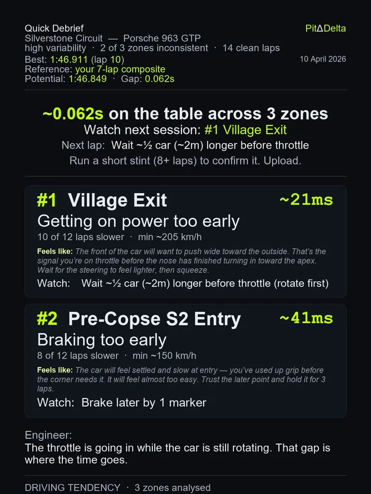 Right now, PitDelta only works off driver input. This means that it takes your best laps and analyses your mistakes in terms of throttle and brake application and advises you where to change those inputs to achieve better stability, rotation etc that in theory, should make you faster but also more consistent.